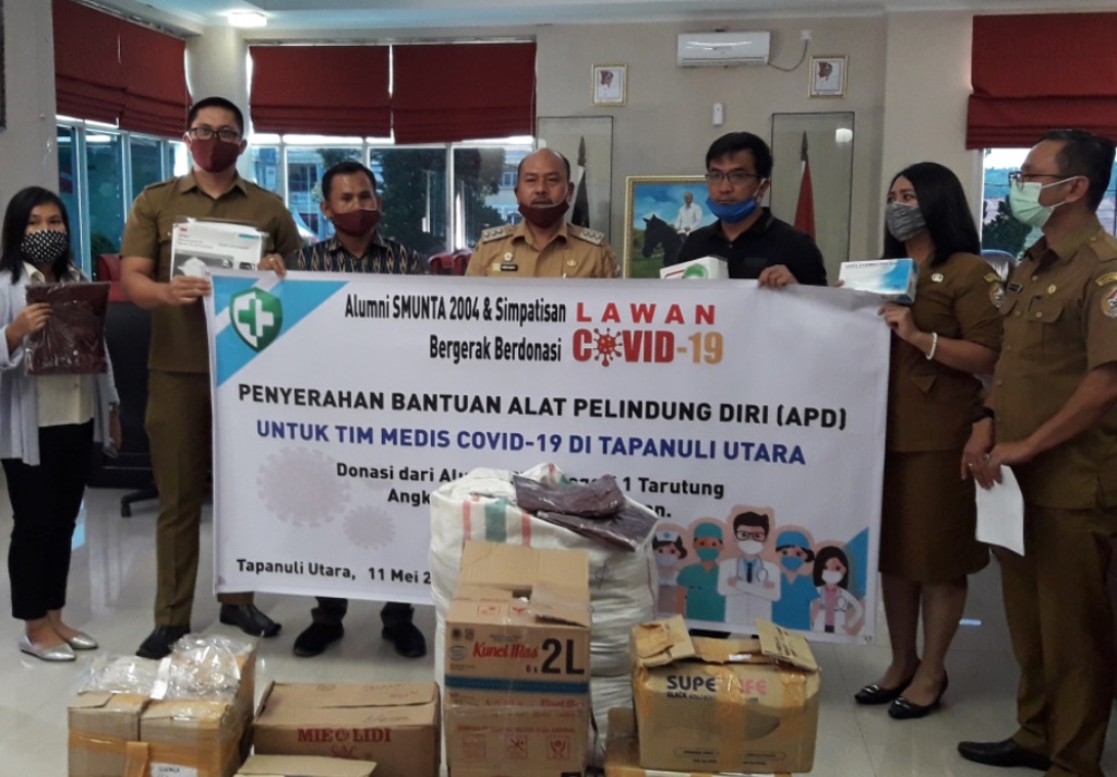 TAPANULI UTARA - Sebagai bentuk dukungan bagi tenaga medis berjuang sebagai garda terdepan penanganan pandemi Covid-19. Alumni SMA Negeri Satu Tarutung (SMUNTA) tahun 2004 mengumpulkan donasi ke Satuan Gugus Tugas melalui penyerahan Alat Pelindung Diri (APD).