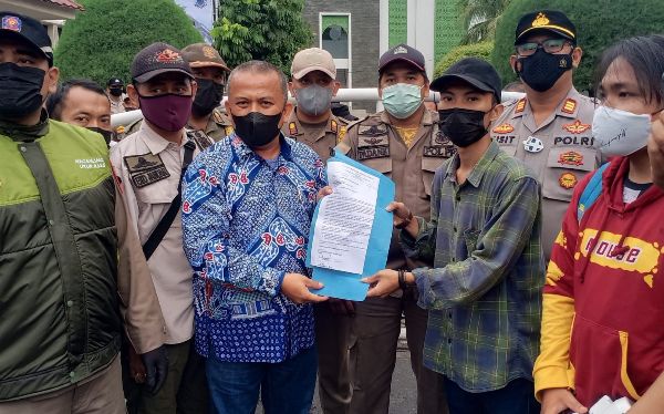 Kepala Bagian Umum DPRD Kota Bekasi, Edison mengwakili Ketua DPRD Kota Bekasi menerima tuntutan dari Aliansi Pemuda Muslim Bekasi (APMI), Kamis (28/10/2021). PALAPA POS/ Yudha