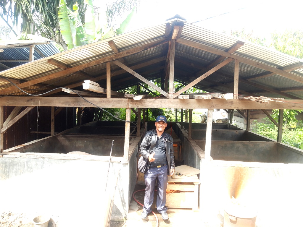 Kepala Desa Rahut Bosi Marhasan Gultom berada di unit usaha ternak babi milik BUMDes. PALAPAPOS/Hengki Tobing