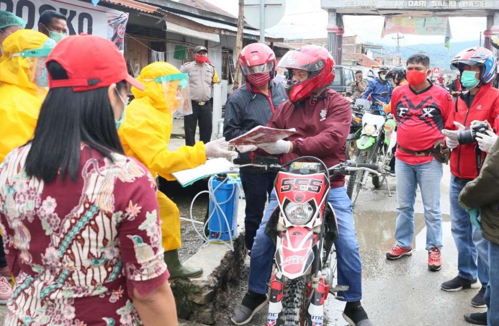 Bupati Taput Nikson Nababan dan rombongan menggunakan Trail turun ke Posko Desa di Kecamatan Siatas Barita monitoring dan memberikan bantuan penguat imunitas tubuh. PALAPAPOS/Alpon Situmorang