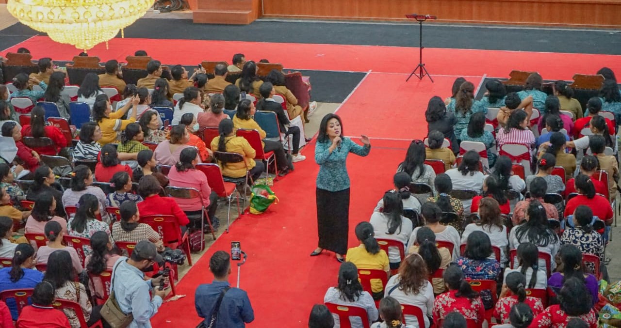 Ketua TP-PKK Taput Satika Simamora selaku narasumber memberikan pemaparan bagi Kader Pembangunan Manusia (KPM) dan Tim Pendamping Keluarga (TPK) dalam rangka mempercepat penurunan kasus stunting. PALAPA POS / Hengki Tobing