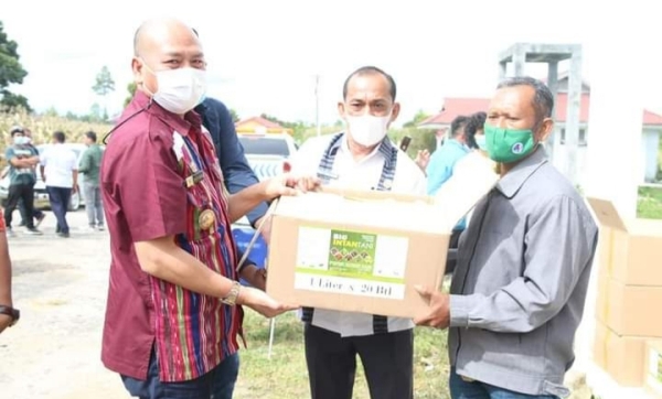 TAPANULI UTARA - Bupati Tapanuli Utara (Taput) Nikson Nababan menyerahkan pupuk cair hayati kepada 578 kelompok tani (Poktan) dari 15 kecamatan dengan total 50.000 liter. Penyerahan dilakukan secara simbolis di Balai Penyuluh Pertanian (BPP) Siarang-arang Tarutung, Jumat (30/72021).