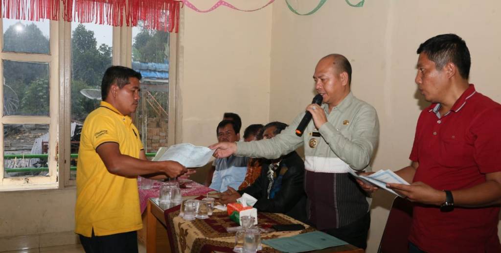 Bupati Taput Nikson Nababan menyerahkan administrasi kependudukan berupa Kartu Keluarga (KK) kepada korban kebakaran di Pangaribuan, beberapa waktu lalu. PALAPAPOS/Hengki Tobing
