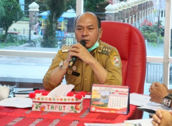 Bupati Taput Nikson Nababan saat mengikuti rapat pembahasan pembahasan pengembangan pariwisata bersama Kemenko Kemaritiman dan Investasi melalui video conference. PALAPAPOS/Hengki Tobing