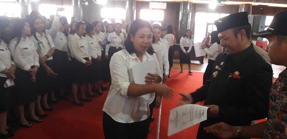 TAPUT - Bupati Tapanuli Utara (Taput) Nikson Nababan menyerahkan seluruh Surat Keputusan (SK) pengangkatan dua ratusan eks Pegawai Tidak Tetap dan eks Tenaga Penyuluh Pertanian menjadi Pegawai Negeri Sipil (PNS) lingkungan Pemerintah Kabupaten Taput, di gedung Sopo Partungkoan, Tarutung, Jumat (22/3/2019).