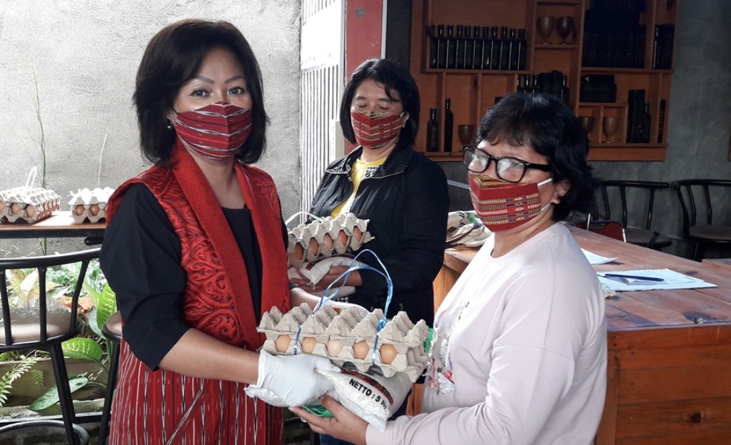 Ketua Dekranasda Taput Satika Simamora saat menyerahkan bantuan paket sembako berupa beras, telur dan minyak goreng kepada perwakilan pengerajin. PALAPAPOS/Alpon Situmorang
