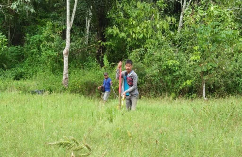 Warga masyarakat melaksanakan pematokan lahan yang akan dibuat kolam. PALAPA POS/Hengki Tobing