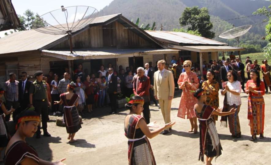 Raja Willem dan Ratu Maxime bersama Menko Maritim dan Investasi Luhut Panjaitan dan Menteri Pariwisata Wisnutama, disambut dengan tarian Batak ‘Tortor Panomunomuan’ saat tiba di Dusun Siambat, tempat berdirinya rumah-rumah Adat Batak yang usianya sudah mencapai ratusan tahun itu.