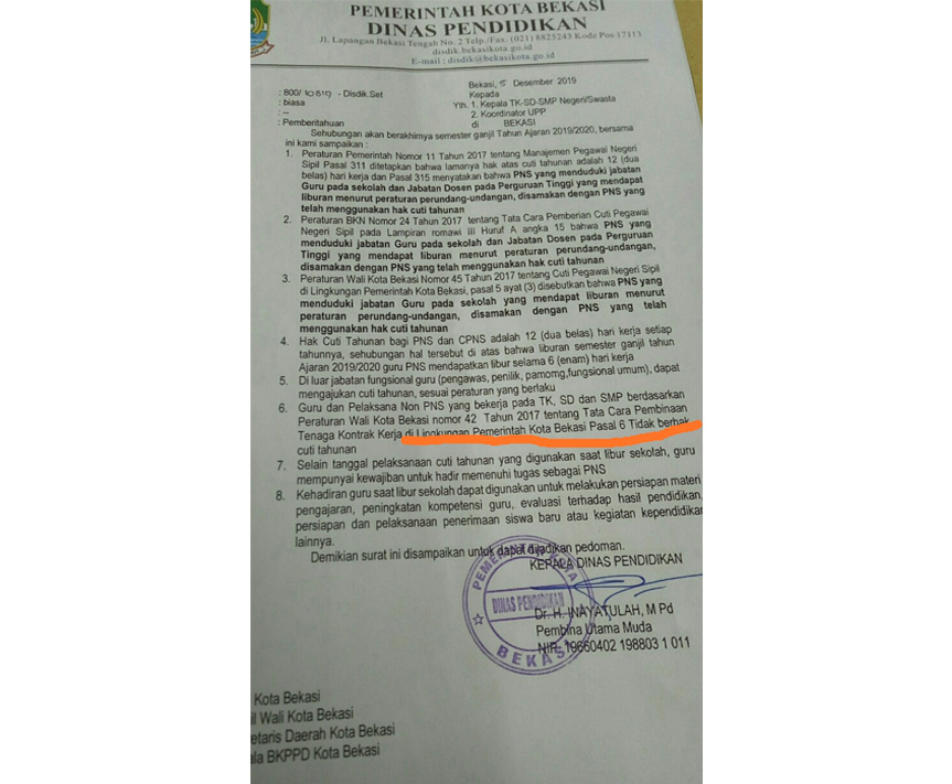 "Kan ada perwalnya, jadi mereka (guru dan pelaksana Non PNS) gak boleh cuti tahunan," ujar Kepala Dinas Pendidikan Kota Bekasi, Inayatullah, Selasa (10/12/2019).