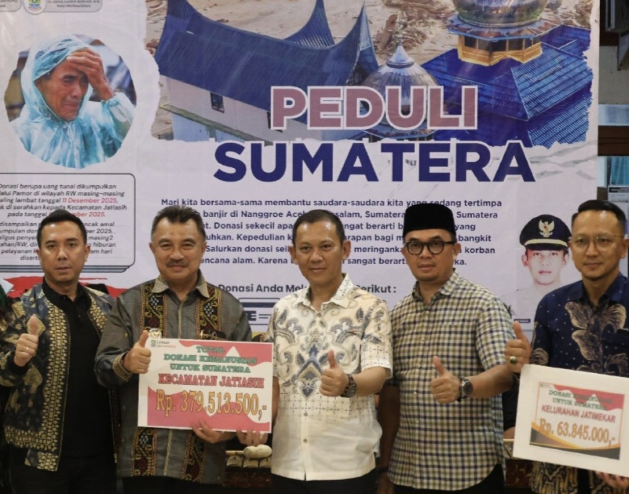 Penyerahan donasi dilakukan di Pendopo Kantor Kecamatan Jatiasih. Bantuan tersebut merupakan hasil penggalangan dana dari seluruh RT dan RW di wilayah Jatiasih, sebagai bentuk solidaritas terhadap korban bencana alam di Aceh, Sumatra Barat, dan Sumatra Utara.