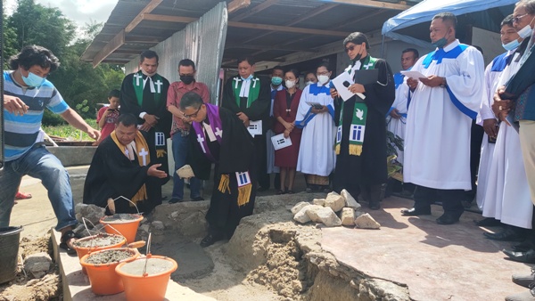 BALIGE - Ephorus HKI Pdt F Sibarani MTh hadiri peletakan batu pertama pembangunan rumah dinas dan kantor HKI Resort Hinalang Silalahi, Kecamatan Balige, Kabupaten Toba, Jumat (12/11/2021).