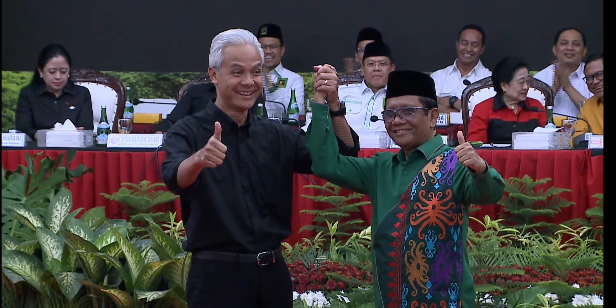 Bakal calon presiden dari PDI Perjuangan (PDIP) Ganjar Pranowo (kiri) dan bakal calon Wakil Presiden Mahfud MD (kanan) usai diumumkan bakal calon wakil presiden pada Pilpres 2024 di kantor DPP PDI Perjuangan, Jakarta, Rabu (18/10/2023). PALAPA POS/ Robesk