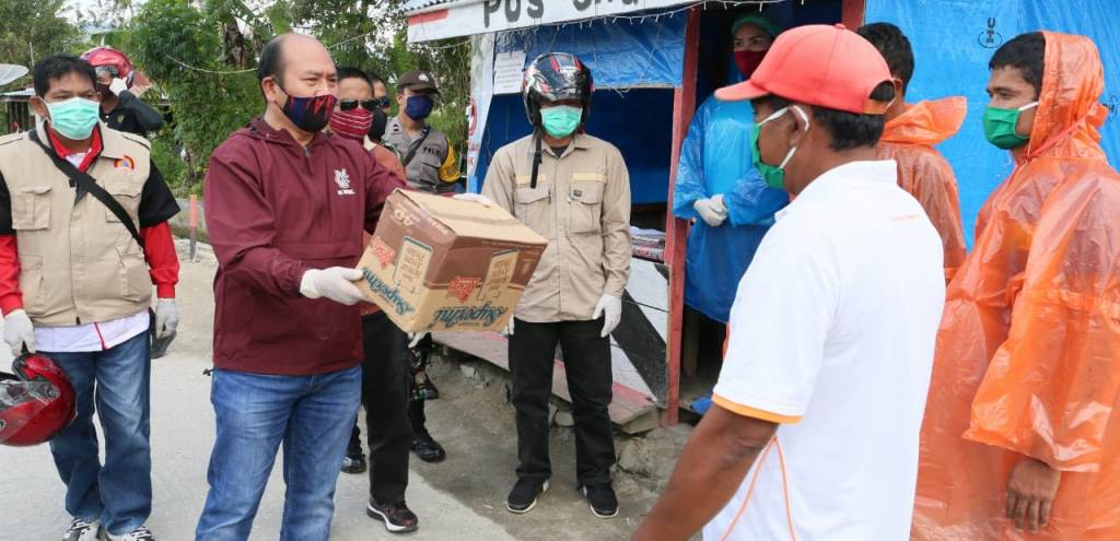 Bupati Taput saat menyerahkan bantuan logistik kepada petugas jaga posko penanganan pencegahan Covid-19. PALAPAPOS/Hengki Tobing
