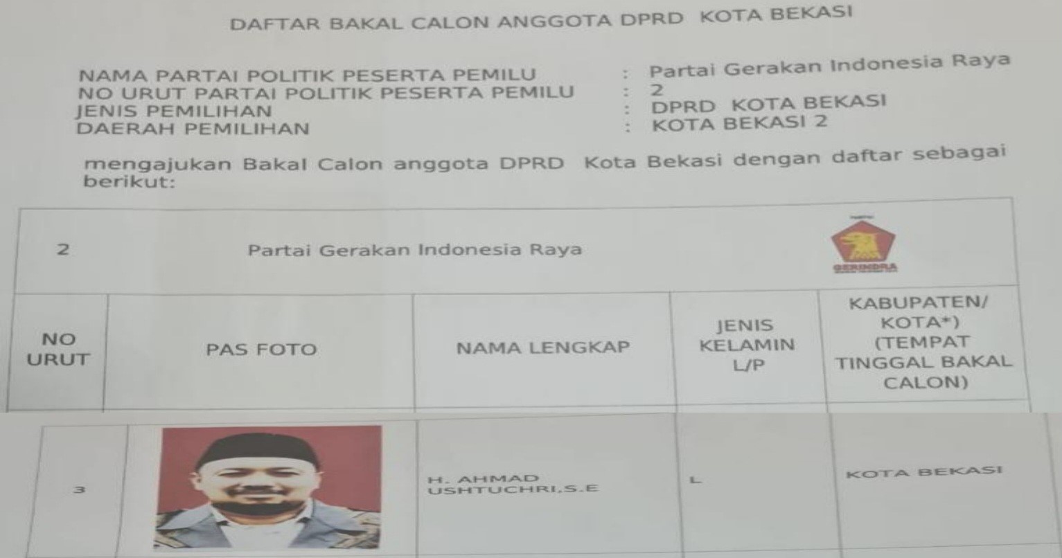 KOTA BEKASI - Politisi senior, Ahmad Ushtuchri dikabarkan hengkang dari DPC Partai Kebangkitan Bangsa (PKB) Kota Bekasi dan memilih singgah Partai Gerindra. Hal itu diperkuat dengan beredarnya selembar kertas daftar bakal calon anggota DPRD Kota Bekasi yang berisikan namanya, Rabu (17/5/2023).