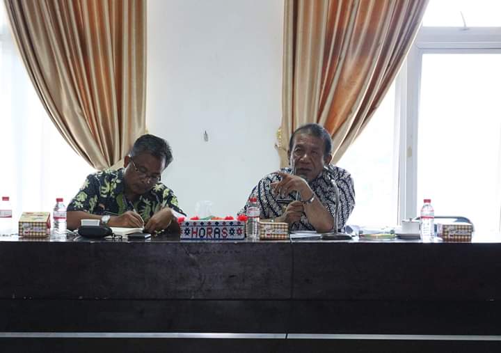 Wabup Taput Sarlandy Hutabarat didampingi Asisten I Parsaorang Hutagalung saat memimpin rapat persiapan Hari Jadi Taput ke-74. PALAPAPOS/Alpon Situmorang