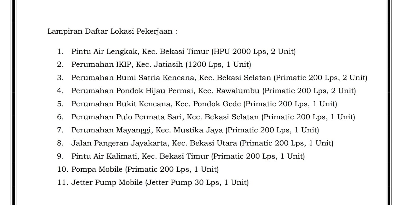 Daftar lokasi pekerjaan pengadaan pompa bersumber dari dana APBD Kota Bekasi sebanyak 14 unit terealisasi, PALAPA POS/ ist