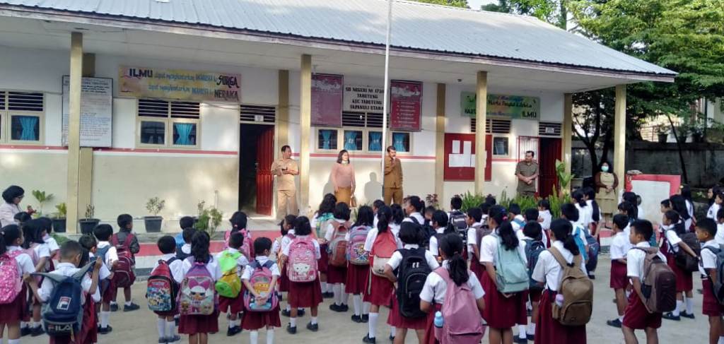 Sekdis Pendidikan Taput Bahal Simanjuntak saat memonitoring hari pertama pasca keputusan meliburkan siswa mengantisipasi penyebaran Covid-19 di salah satu SD di Tangsi, Tarutung, Tapanuli Utara. (Palapa Pos/Alpon Situmorang)