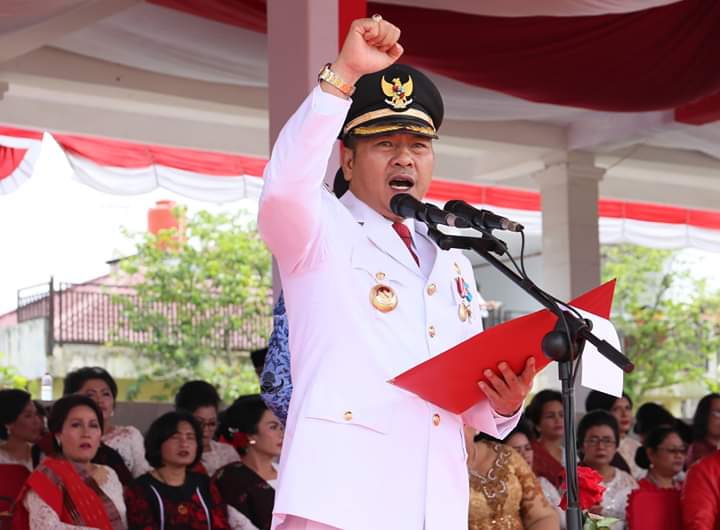 Bupati Taput Nikson Nababan saat berpidato pada upacara peringatan HUT Kemerdekaan RI ke-74 di lapangan mini Tarutung. PALAPAPOS/Hengki Tobing