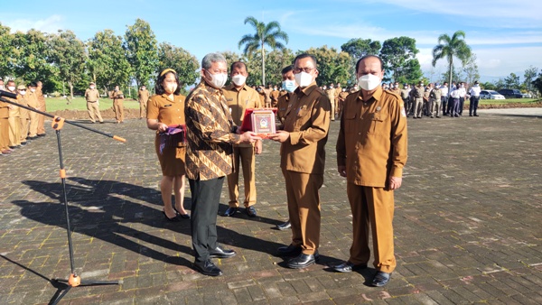 Piagam penghargaan diserahkan langsung oleh Kepala Kantor Regional VI BKN Medan, Aidu Tauhid dan diterima Bupati Toba Poltak Sitorus didampingi Kepala BKD Kasten Panjaitan saat kegiatan apel gabungan di halaman kantor Bupati Toba, Senin (6/12/2021).