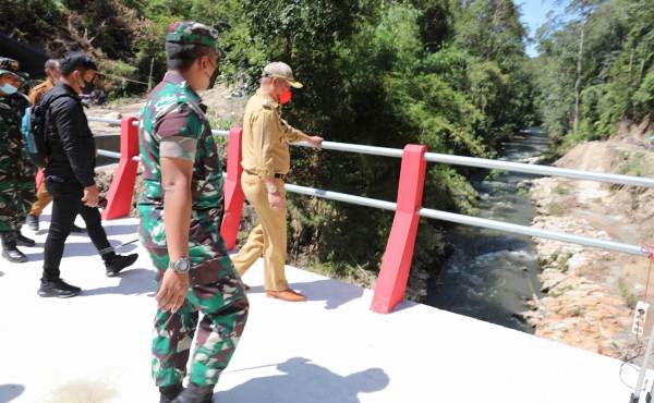 Bupati Taput Nikson Nababan didampingi Dandim 0210 TU Letkol.Inf. Hari Sandra saat peresmian jembatan interkoneksi antar desa sebagai kado tahun baru, Selasa (28/12/2021) PALAPA POS/ Alpon Situmorang