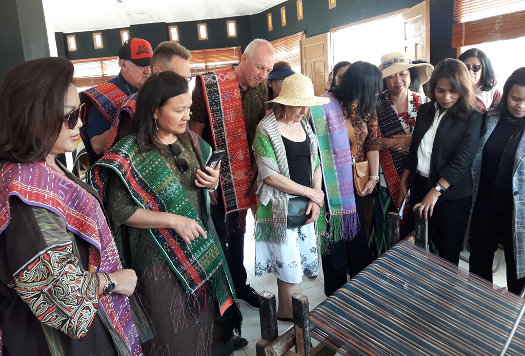 Rombongan warga Perth Australia, Diaspora Network dan Konjend RI saat diarahkan melihat aktivitas petenun pewarna alam Muara. PALAPAPOS/Alpon Situmorang