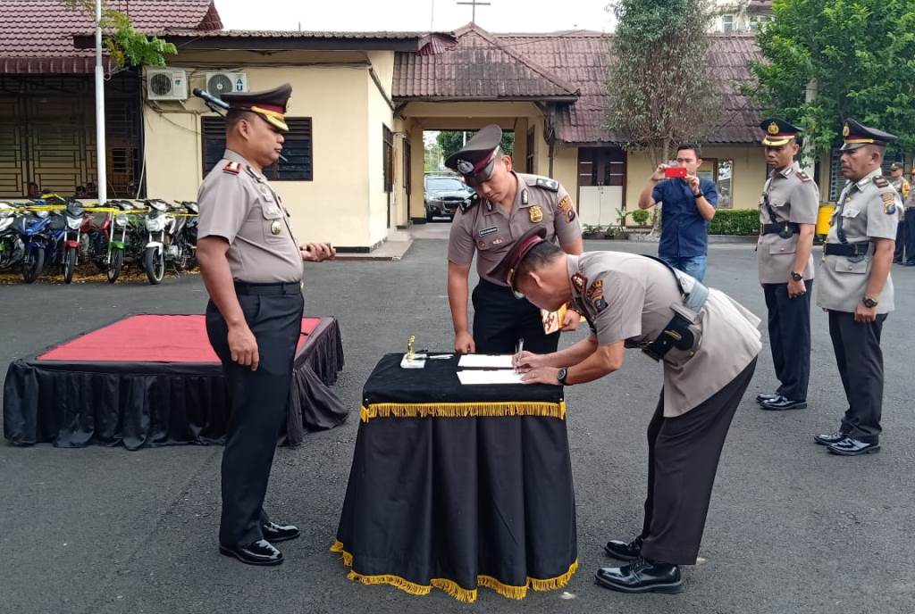 TEBINGTINGGI - Kapolres Tebing Tinggi AKBP Sunadi memimpin langsung upacara serah terima jabatan (Sertijab) dua perwira di wilayah hukum Polres Tebing Tinggi, yakni Waka Polres dan Kabag Ops Polres Tebing, yang dilaksanakan dihalaman Mapolres Jalan Pahlawan Kota Tebing Tinggi, Senin (11/3/2019) pagi.