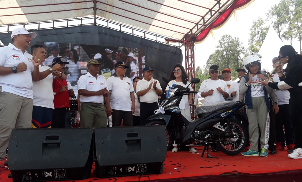 Kapolres Taput AKBP Horas M Silaen, Sekda Edward Tampubolon, Ketua TP PKK Satika Simamora dan lainnya saat menyerahkan door prize hadiah utama satu unit sepeda motor dalam Milenial Road Safety Festival. PALAPAPOS/Alpon Situmorang