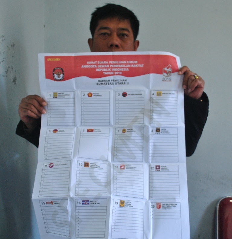 Komisioner KPUD Humbahas, Divisi Teknis, Ramses Simamora mengenalkan surat suara untuk pemilu 2019. PALAPAPOS/Andi Siregar