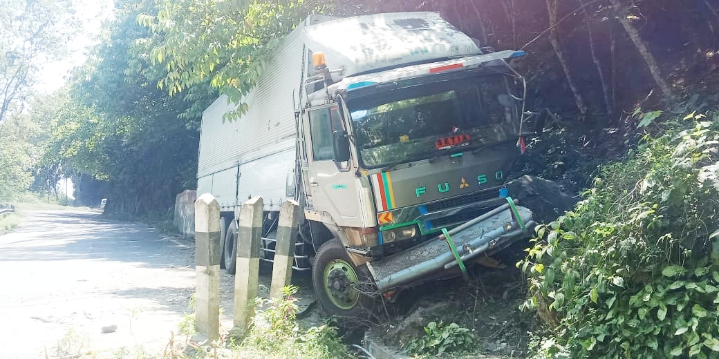 PARAPAT - Sebuah kontainer datang dari arah Medan tujuan Parapat dan menghantam Gadril (tiang tembok) pengaman bahu jalan di Jalan Lintas Sibaganding-Parapat, Kecamatan Girsang Sipangan Bolon, Kabupaten Simalungun, Sumatera Utara, Kamis (8/8/2019) sekitar pukul 04.00 Wib.