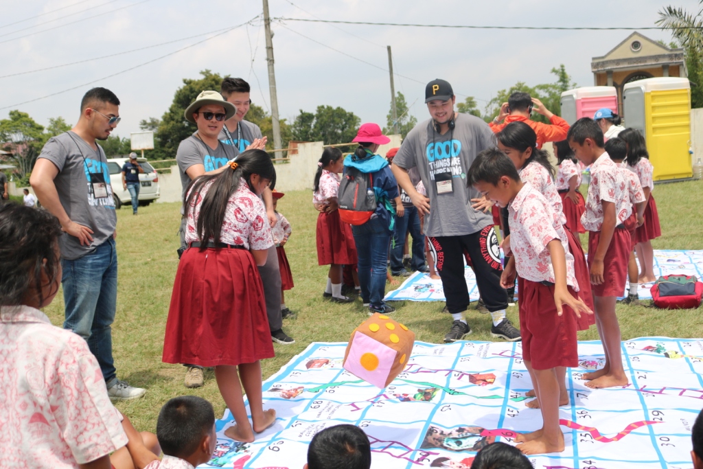 KARO - Lapangan SD Negeri 044839 Bulan Jahe, Kabupaten Karo, pukul 10.00 Wib, ramai dengan berbagai aktivitas yang melibatkan siswa. Namun tidak seperti biasanya, siswa-siswi sekolah dasar tersebut tampak bersemangat mengecat mural di dinding kelas dan bermain ular tangga raksasa di tengah lapangan bersama-sama dengan warga berkebangsaan asing yang kompak mengenakan kaus abu-abu bertuliskan Good Things are Happening.