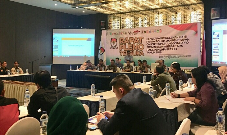 MEDAN - Komisi Pemilihan Umum (KPU) Sumatera Utara menetapkan 100 angggota legislatif terpilih periode 2019-2024 hasil Pemilu Legislatif 2019 melalui rapat pleno terbuka yang digelar di salah satu hotel di Medan, Selasa (27/8/2019).