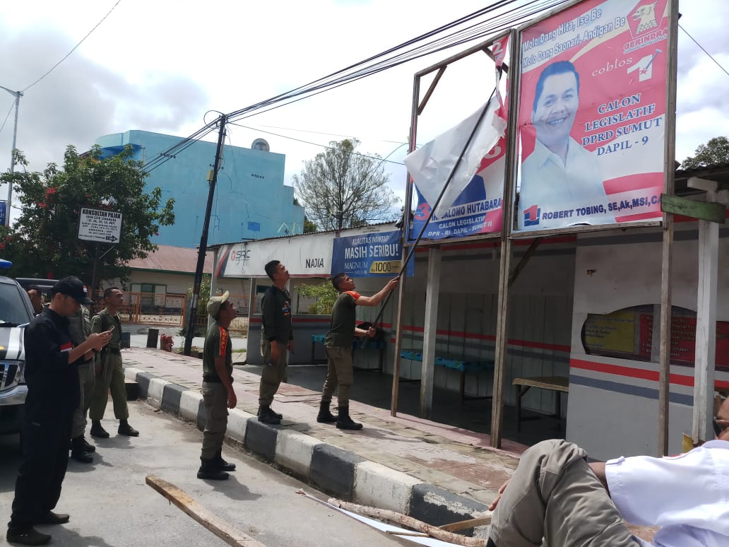 Ketua Bawaslu Humbahas Henri Wesley Pasaribu bersama tim dari Satpol-PP melakukan pembersihan APK di pusat kota Dolok Sanggul. PALAPAPOS/Andi Siregar