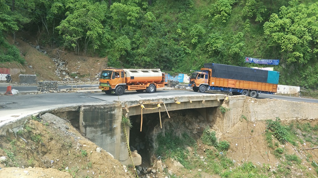 "Jembatan ini dihantam benturan keras membuat pondasinya agak terganggu, belum lagi sejumlah alat berat yang harus membersihkan material longsor dari bahu jembatan, diikuti truk-truk mitra PT TPL dan jenis lainnya seperti pembawa pakan pellet (pakan ikan Nila) truk jenis kontainer, tronton lainnya yang mengangkut material ke PT Inalum membuat jembatan ini semakin goyang saat menahan beban bertonase berat itu," jelas Sinaga.