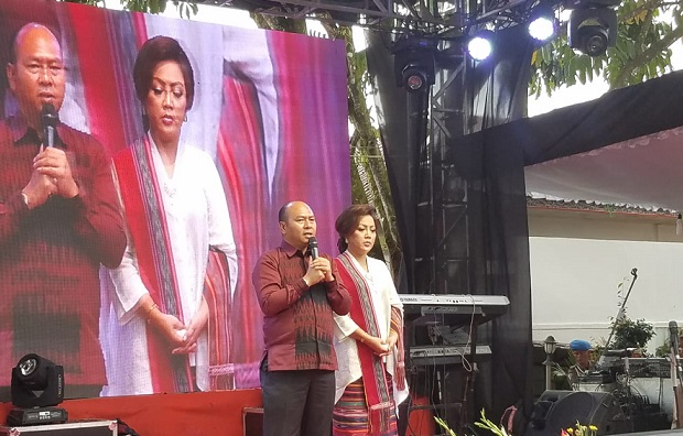 Bupati Taput Nikson Nababan dan istri Satika Simamora saat menyampaikan sambutan dalam acara syukuran. PALAPA POS/ Hengki Tobing