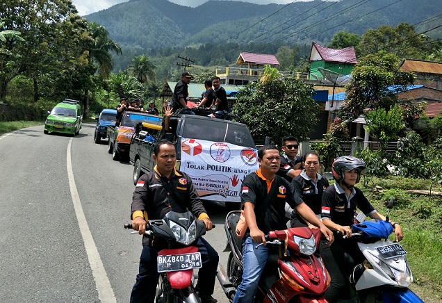 Ketua Panwaslu Jes Sihotang dan jajarannya juga menggunakan pengeras suara menyampaikan untuk menolak politik uang.