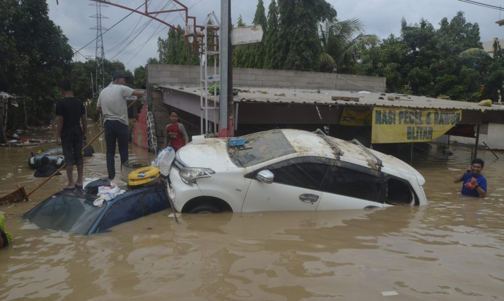 Sejumlah warga menaiki mobil yang terdampak banjir di Perumahan Pondok Gede Permai Bekasi, Jawa Barat. PALAPAPOS/Nuralam