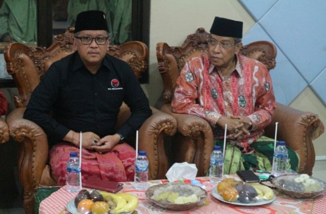 Pembina Ponpes Luhur Al Tsaqafah sekaligus Ketua Umum PBNU Said Aqil Siradj (kanan) menerima kunjungan silaturahmi DPP PDI Perjuangan yang diwakili Sekjen PDIP Hasto Kristiyanto di Jakarta, Selasa (8/10/2019) malam. PALAPA POS/Istimewa