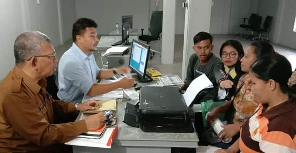 Kepala Dinas Koperasi dan UMKM Marco Panggabean mendampingi penenun mengurus permohonan KUR dari BNI Tarutung. PALAPAPOS/Hengki Tobing