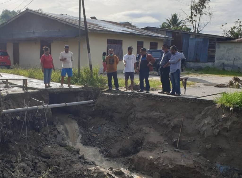 Sekda Taput Indra Sahattua Simaremare didampingi Kabag Administrasi Pembanguna, Kabag PBJ, Kabid Pembangunan Jalan Jembatan Dinas PUPR , Lurah Huta Toruan IX dan mewakili BPBD saat meninjau badan jalan Rangkea Sipagagan yang longsor. PALAPAPOS/Alpon Situmorang