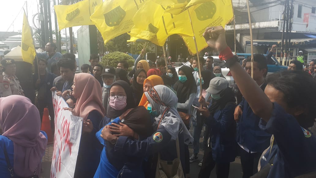 Demo puluhan mahasiswa yang tergabung dalam Pergerakan Mahasiswa Islam Indonesia (PMII) Bekasi di depan Pengadilan Negeri Bekasi, Jalan Pramuka, Bekasi Selatan, Selasa (3/12/2019). PALAPAPOS/Nuralam