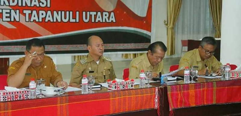 TAPANULI UTARA - Bupati Tapanuli Utara Nikson Nababan bersama Wakil Bupati Sarlandy Hutabarat memimpin rapat kordinasi (Rakor) dengan aparatur di lingkungan Pemerintah Kabupaten Taput yang menghadirkan seluruh Asisten, Staf Ahli, pimpinan Organisasi Perangkat Daerah (OPD) dan seluruh pejabat Eselon III, di aula Kantor Bupati Tapanuli Utara, Selasa (18/2/2020).