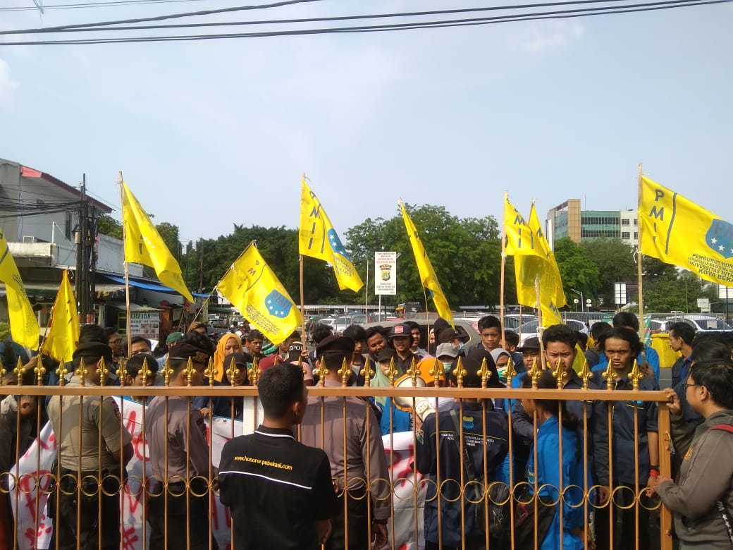 Demo puluhan mahasiswa yang tergabung dalam Pergerakan Mahasiswa Islam Indonesia (PMII) Bekasi di depan Pengadilan Negeri Bekasi, Jalan Pramuka, Bekasi Selatan, Selasa (3/12/2019). PALAPAPOS/Nuralam
