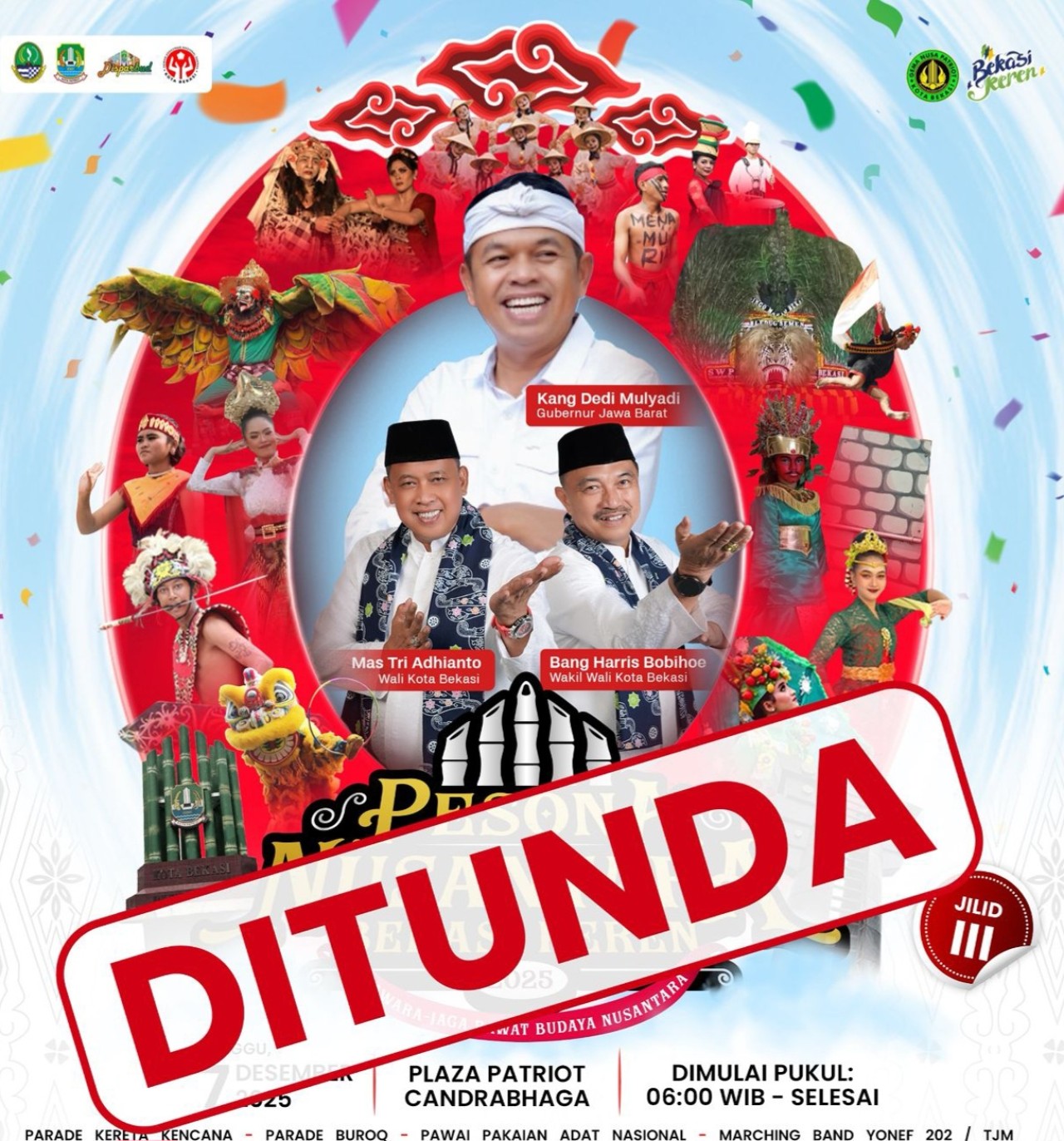 KOTA BEKASI - Pemerintah Kota Bekasi melalui Dinas Pariwisata dan Budaya resmi menyampaikan bahwa Pesona Nusantara Bekasi Keren (PNBK) Jilid 3 Tahun 2025, yang semula dijadwalkan berlangsung pada Minggu, 7 Desember 2025 ditunda hingga waktu yang akan ditentukan kemudian.