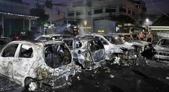 Sejumlah mobil terbakar di Kompleks Asrama Brimob imbas dari demonstrasi menolak hasil hitungan KPU. PALAPA POS/Istimewa