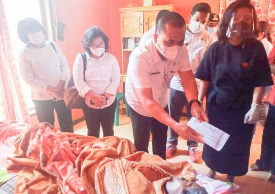 Ketua PPTSB Taput Kijo Sinaga didampingi pengurus saat menyalurkan bantuan pengobatan Jekson Sinaga. Rabu (28/7/2021). PALAPA POS/ Alpon Situmorang