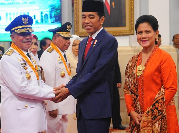 Presiden Joko Widodo (tengah) didampingi Ibu Negara Iriana (kanan) menyalami Gubernur Maluku Utara Abdul Gani Kasuba usai pelantikan. PALAPA POS/Istimewa