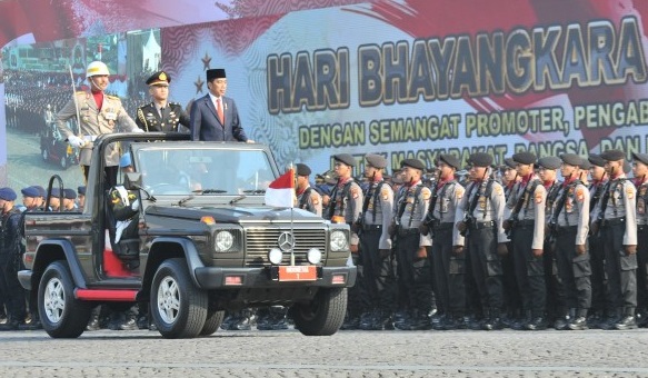 Presiden Joko Widodo menjadi inspektur upacara peringatan Hari Bhayangkara ke-73. "Kedua, kedepankan strategi proaktif dan preventif dengan pendekatan dan tindakan humanis. Ketiga, terus tingkatkan kualitas pelayanan publik yang modern, mudah dan cepat," kata Presiden.