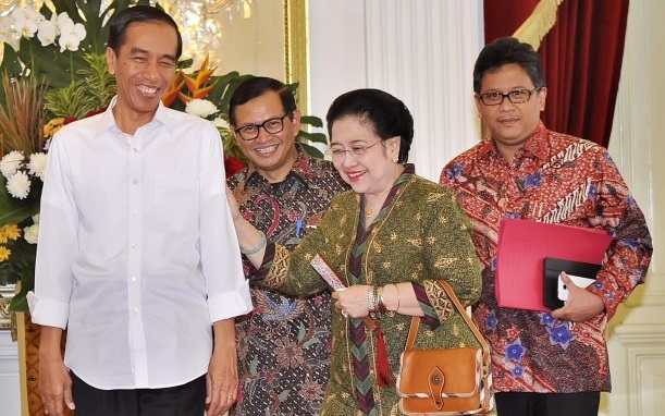 Presiden Joko Widodo (kiri) menyambut Ketua Umum PDI Perjuangan Megawati Soekarnoputri (kedua kanan) didampingi Seskab Pramono Anung (kedua kiri) serta Sekjen PDI-P Hasto Kristiyanto (kanan) di Istana Merdeka, Jakarta. PALAPA POS/Istimewa