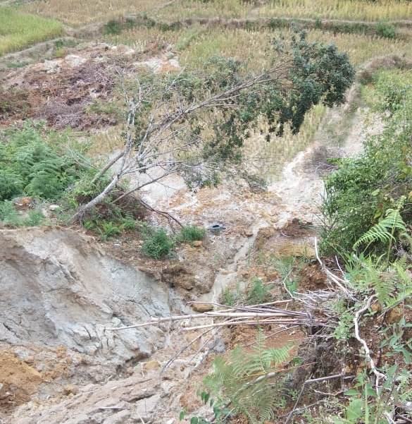 Akibat longsoran itu, puluhan hektar persawahan milik warga dihantam material batu dan tanah dari longsoran bangunan jalan Hotmix serta Dyk pengaman tersebut.