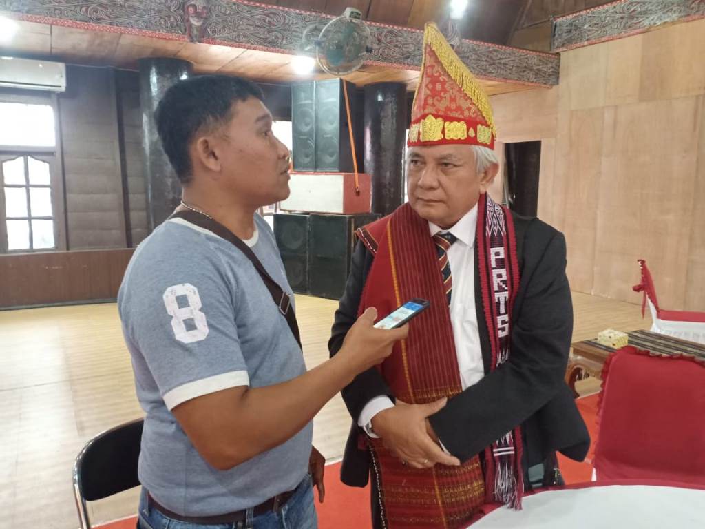 Ketua Umum Parsadaan Raja Toga Sitompul Marsda TNI (Purn) Jhonny FP Sitompul saat diwawancarai. PALAPAPOS/Alpon Situmorang